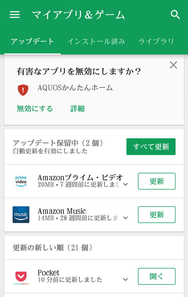 有害なアプリの無効化 「AQUOSかんたんホーム」はお使いの端末に有害である可能性があります。