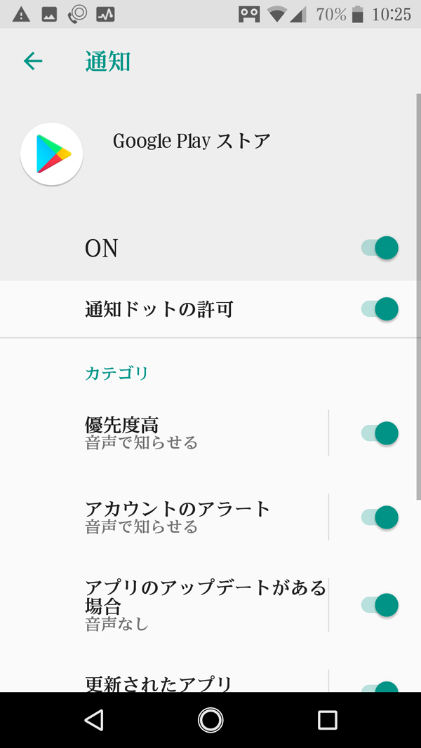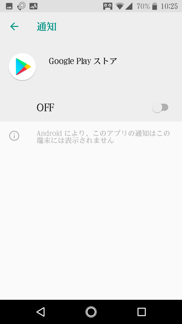 設定 → アプリと通知 → 通知 → 通知 → Google Play ストア → ONの横のスライダタップ